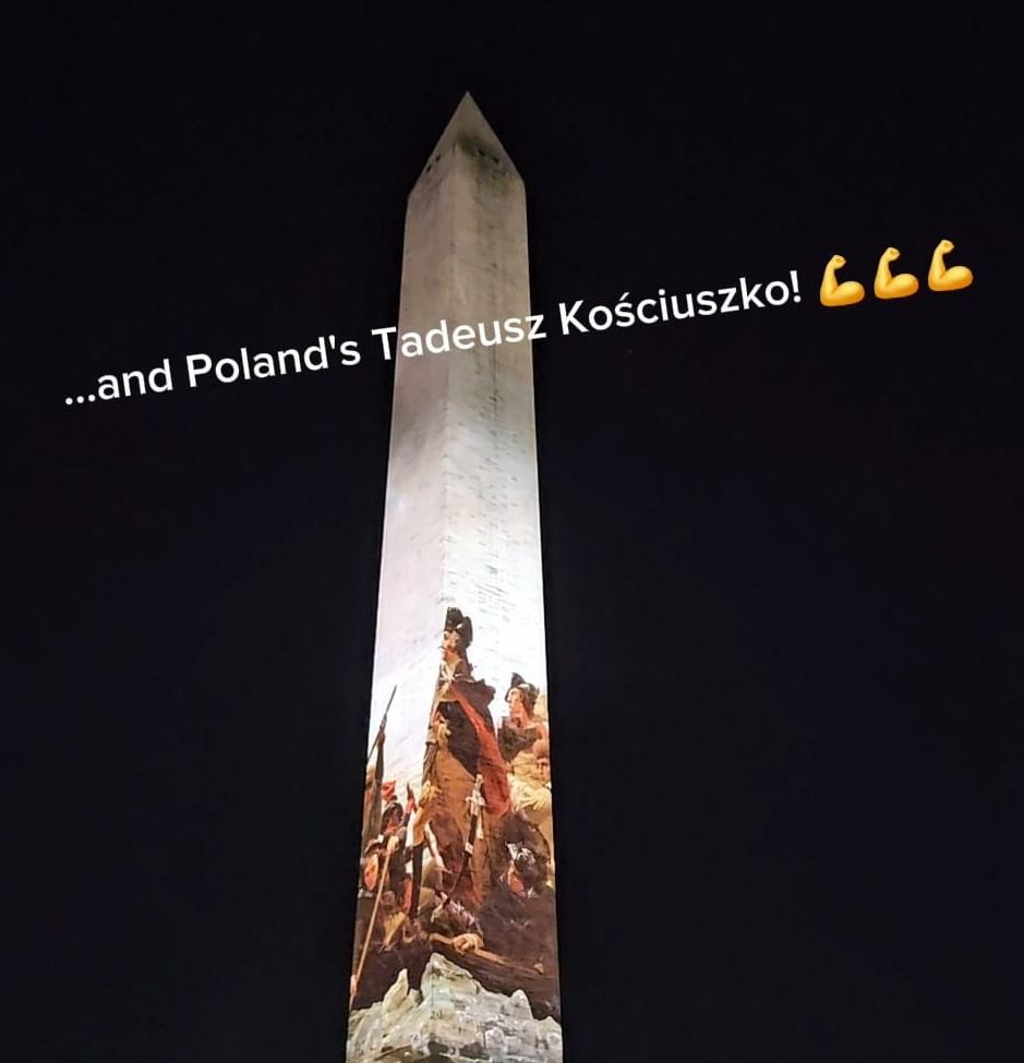 This photo, provided by the Polish Embassy, is a still from a video taken on January 4, 2026 at the National Mall. The illumination of the Washington Monument helped launch the America250 celebrations highlighting, among other stories, the contributions of General Tadeusz Kościuszko to the American Revolutionary War. The Embassy said, “We could not be more proud.”